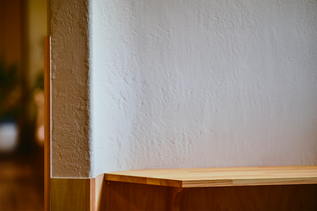繊維質が現れる塗り仕上を採用しました。 左官職人の手仕事、素材、丸みある形状が柔らかな反射光を作り、温かみを増してくれます。