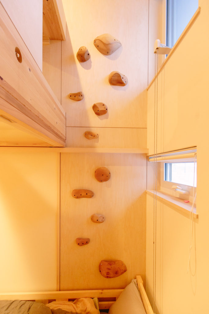 その仕切りをまたぐように、1階から2階へとボルダリングの木製ホールドが配置されています。