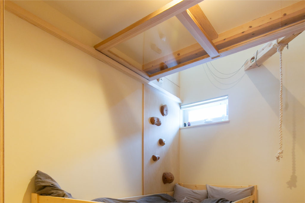 それぞれの小さな居場所から、2階にある家族共有の屋根裏風スタディコーナー(机は専有)へ、ボルダリングでも登っていけます。