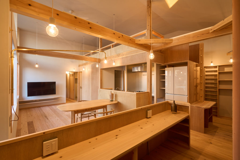 「リビングとダイニングとキッチン」 を眺める、家族4人のワークテーブル。