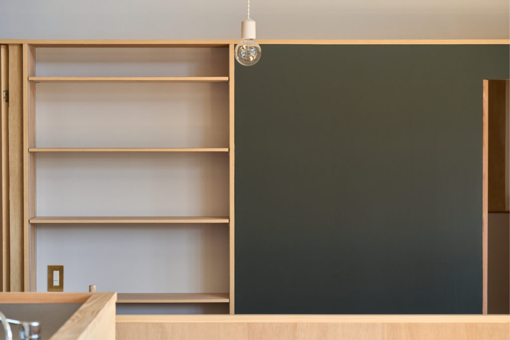 玄関からパントリーを通りキッチンへと向かう動線、ご家族それぞれが長い机を共有できる作業スペース、その背面にはマグネット付きの黒板、ランドリールームなど